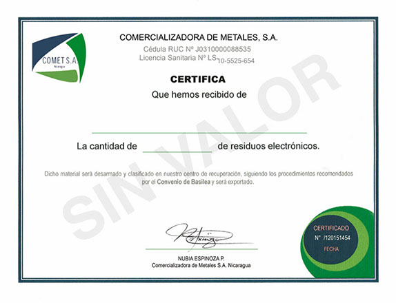 Somos expertos en desarmar, separar y clasificar material electrónico para su adecuado reciclaje respetando las normas nacionales e internacionales del medio ambiente. Emitimos certificados de destrucción avalado por el MARENA (Ministerio del Ambiente y los Recursos Naturales).